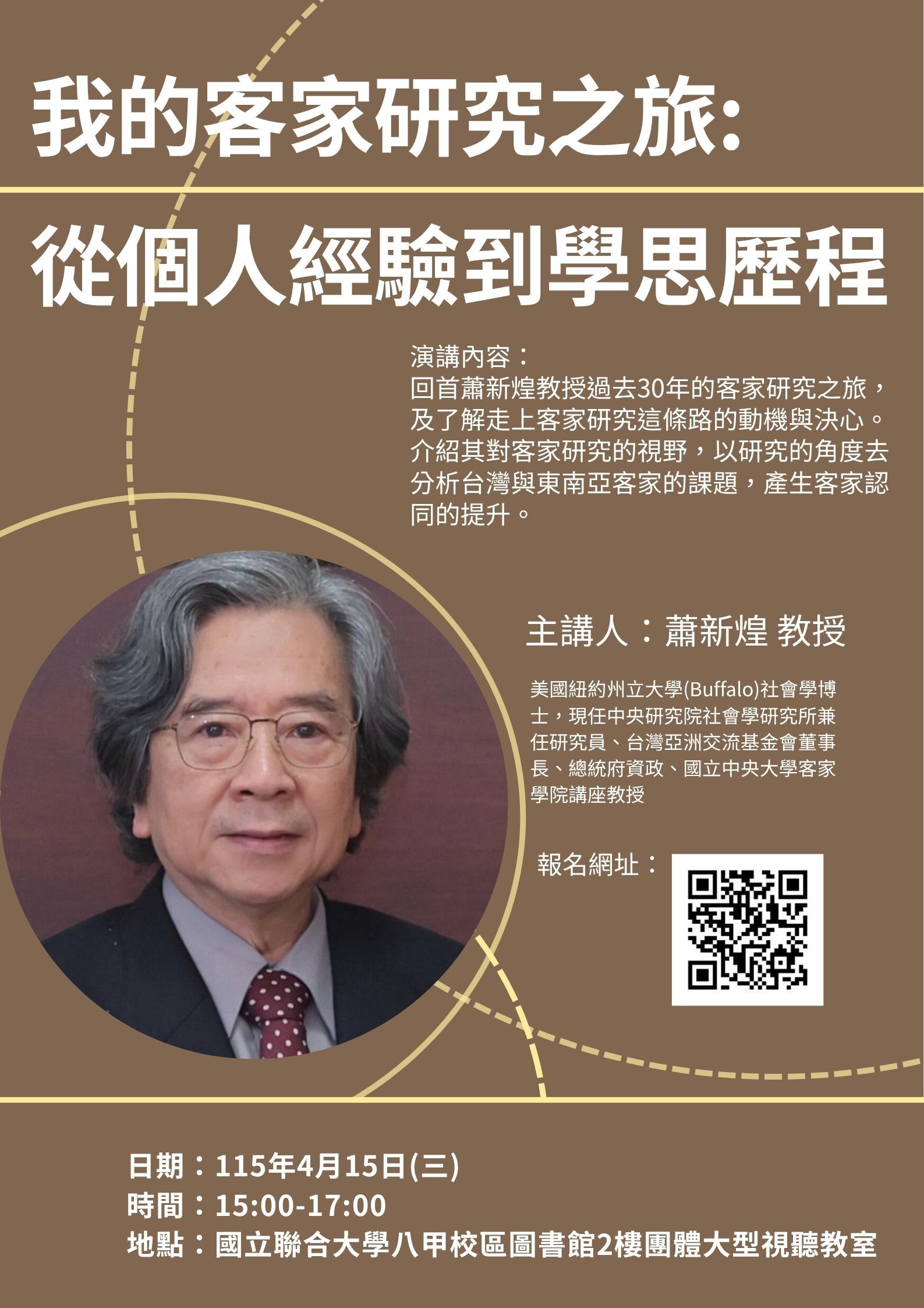 歡迎踴躍報名參加由客委會學發會召集人蕭新煌教授主講「我的客家研究之旅:從個人經驗到學思歷程」講座